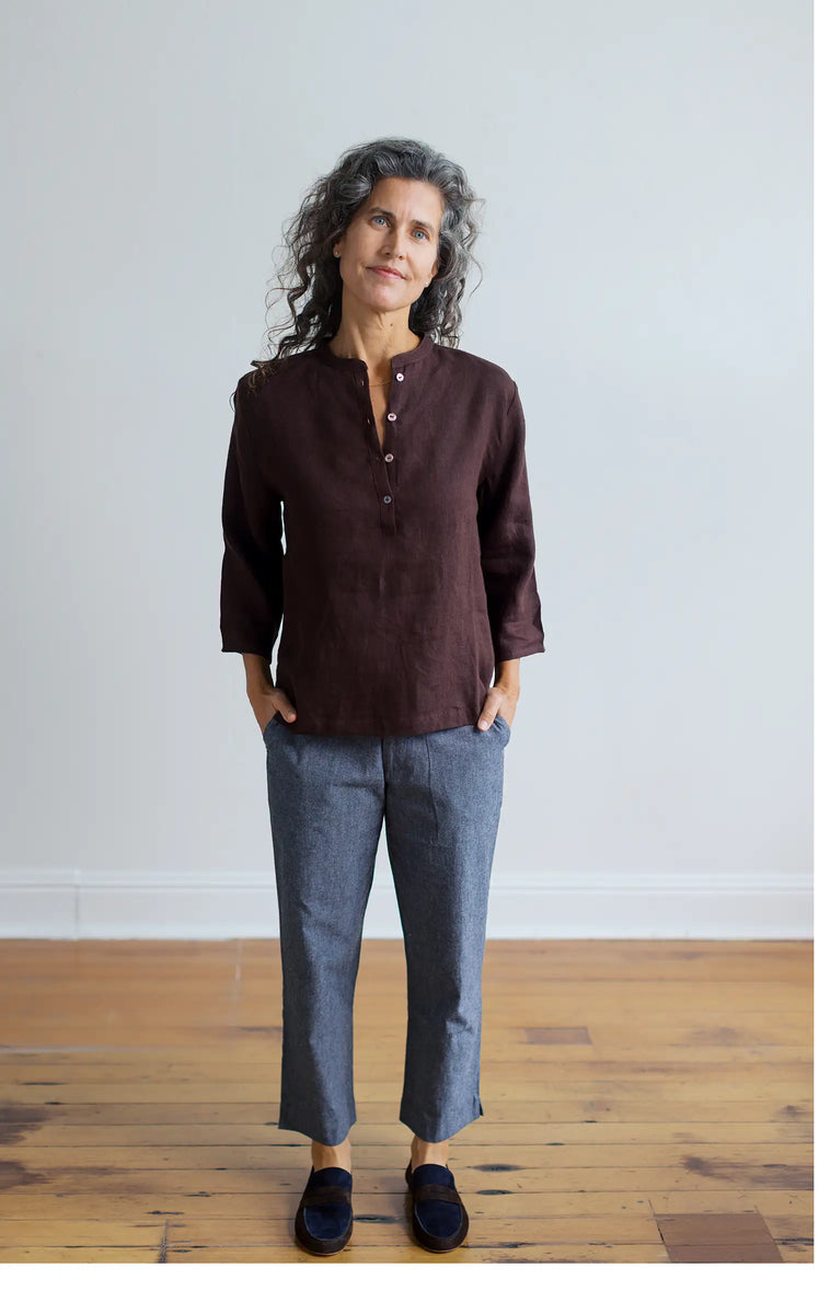 I created the atelier top based on my favorite vintage kurta from India. Made in all my favorite fabrics, it's the perfect easy top for a solid day's work in my studio.