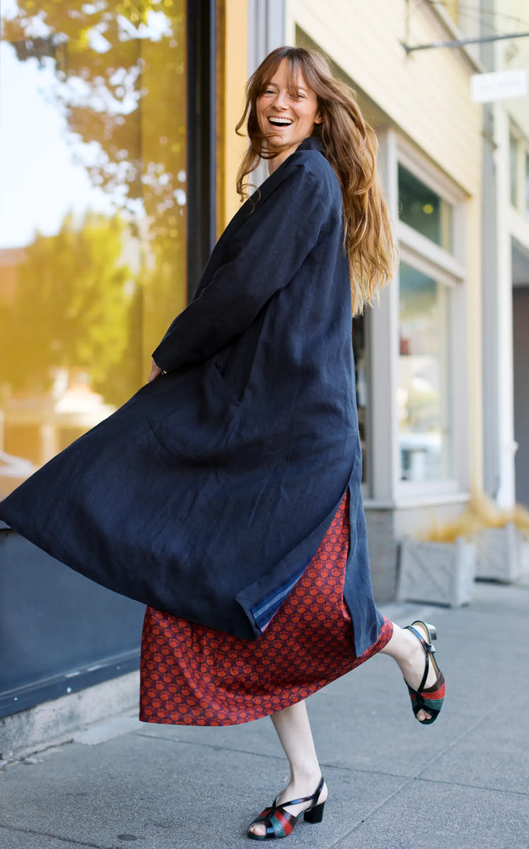 This coat was inspired by a vintage military coat from Japan. Its a button down with just the right sized collar. There are flaps over the pockets that can be tucked in depending on your mood… I love the versatility! This coat has quite a deep vent in the back keeping it really comfortable… not confining at all. I love a coat that has some swing. All in all its very tailored and makes me feel incredibly put together no matter what I’ve got on underneath!!