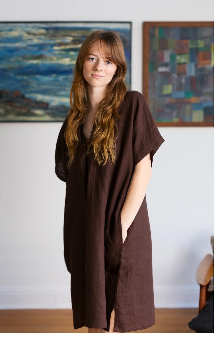This is a really wonderful piece. The Viv was inspired by an absolutely beautiful victorian nightie I found white flea marketing in Brooklyn with my daughter. I created a very utilitarian version… a dress you could just throw on in an easy breezy kind of way. It has a delicate v neck with light gathers across both the chest and back. The sizing on this piece is quite fluid. Designed to hit just below the knee. Size up for an over sized vibe or down to wear as a tunic over jeans.