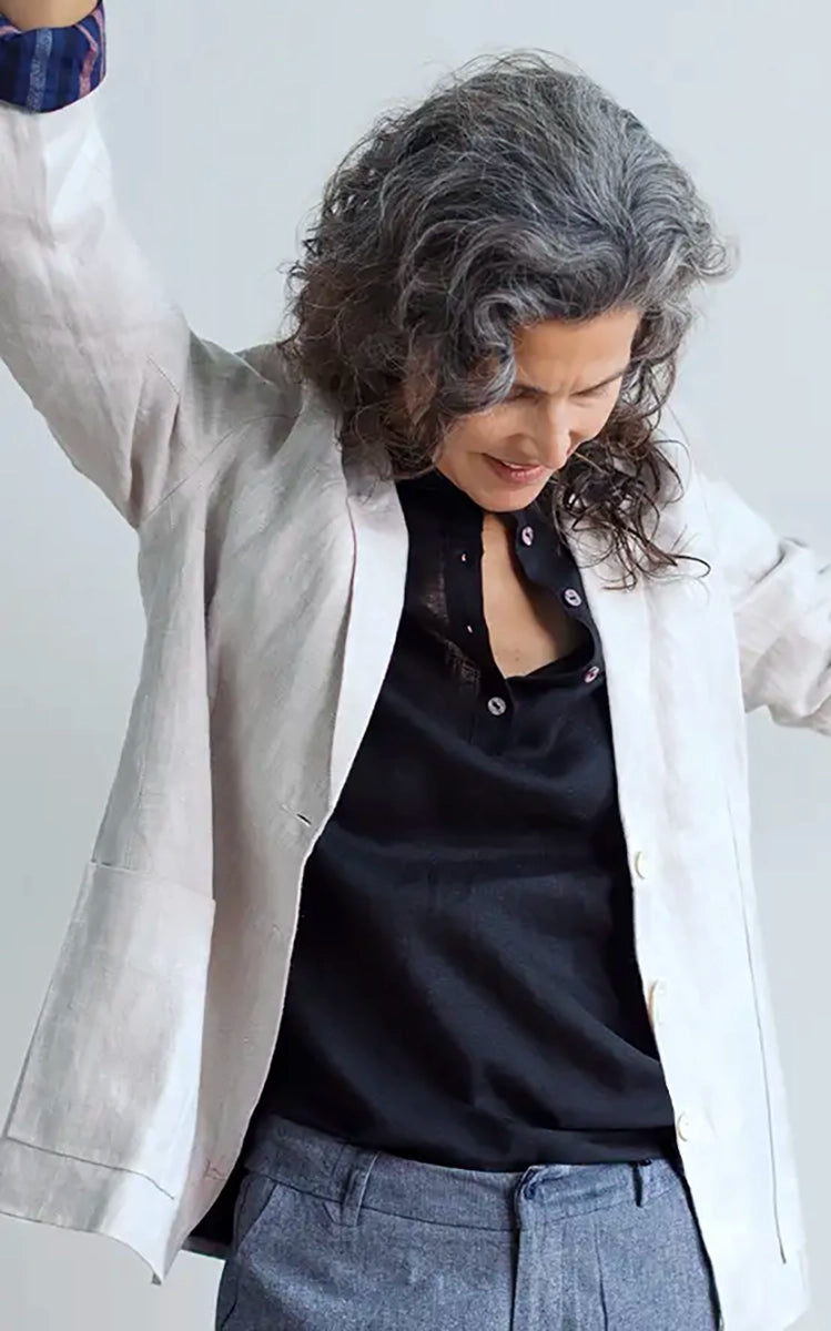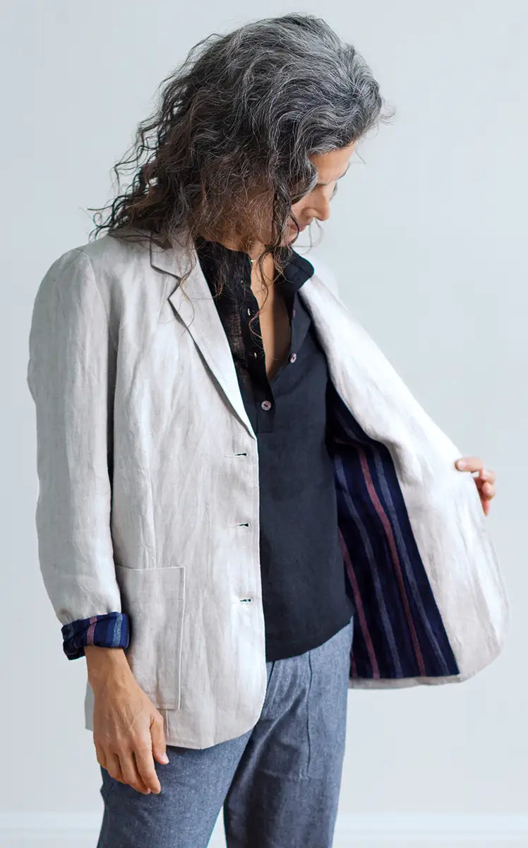 This blazer is really great… I mean really. The basic pattern comes from a vintage piece in my personal collection. A 1970s blazer with front patch pockets and a deep vent in the back making the whole piece fall so beautifully. I’ve lined it with natural linen to give it a bit of weight and structure. It’s soft, casual… the best for everyday!