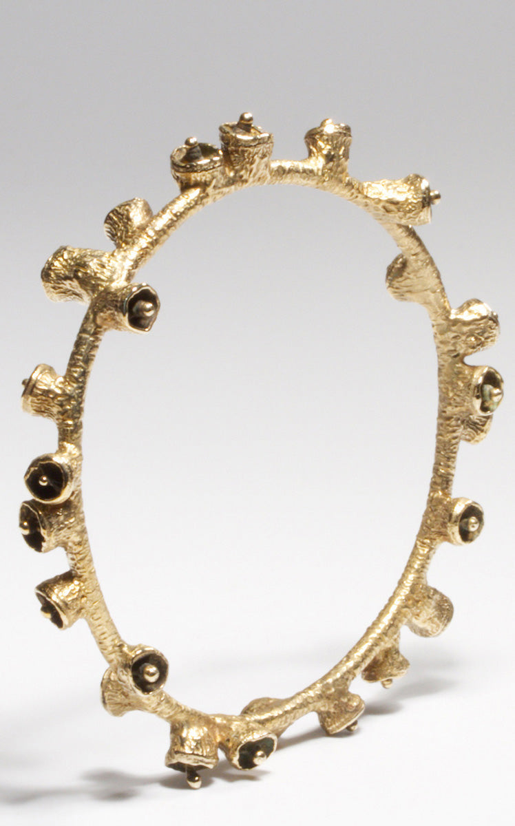 The bracelet can be worn as a bangle or secured mid-way up the arm. Inspired by eucalyptus pod clusters, Kirsten distills nature’s diversity of textures, forms and imperfections. The designs are hand-carved in wax and then cast. The interior of the pods are oxidized with a verdigris green patina.