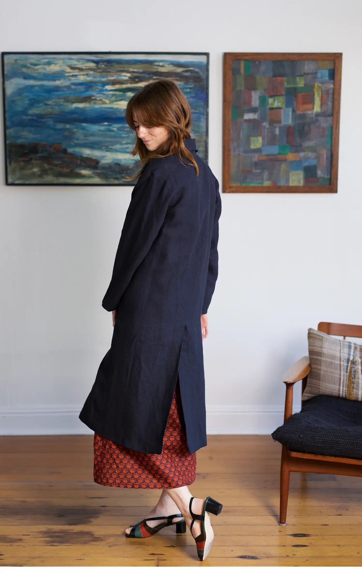 This coat was inspired by a vintage military coat from Japan. Its a button down with just the right sized collar. There are flaps over the pockets that can be tucked in depending on your mood… I love the versatility! This coat has quite a deep vent in the back keeping it really comfortable… not confining at all. I love a coat that has some swing. All in all its very tailored and makes me feel incredibly put together no matter what I’ve got on underneath!!